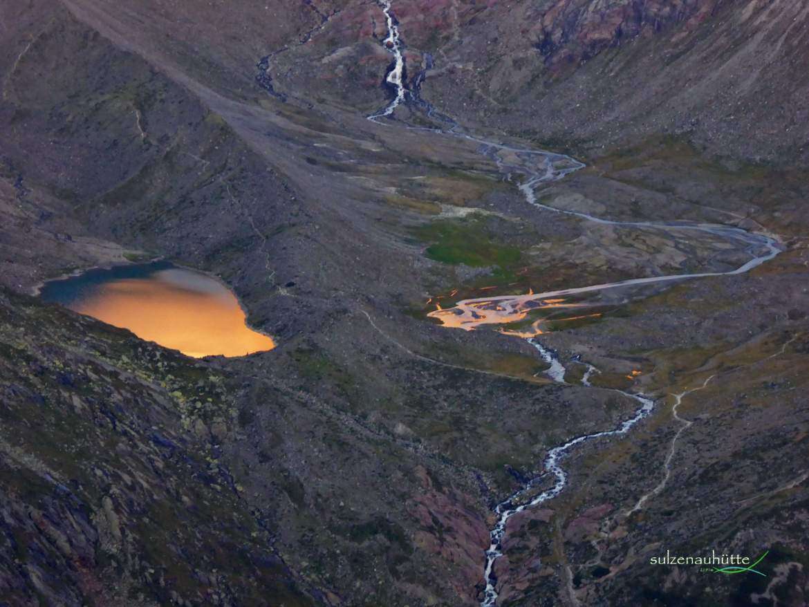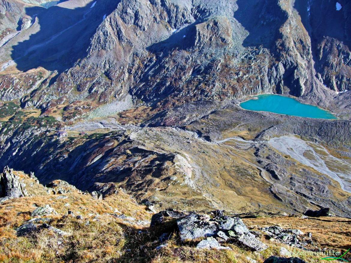 Die Blaue Lacke und Sulzenauhütte vom Stubaier Höhenweg aus fotografiert